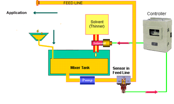 美國cambridge在線粘度計VISCOpro2000, VISCOpro1600等型號,具備強大的在線粘度檢測和粘度控制功能。下圖詳細解釋了應用cambridge粘度計,通過單閉環粘度自動控制方式設計,實現粘度的自動控制,保證了粘度參數的精度和穩定性。