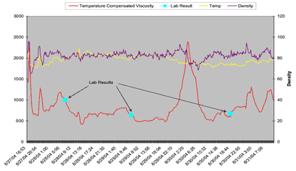 巴西的Petrobras公司進(jìn)行了實(shí)地試驗(yàn),跟蹤運(yùn)動(dòng)學(xué)粘度(即組合測(cè)量絕對(duì)粘度和密度)和溫度。結(jié)果讓人印象深刻, 第一次該公司可以很容易的看到在他們的過程中發(fā)生了什么。