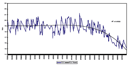 一個標準的安裝位置on-engine劍橋粘度計在潤滑油返回行。附表3顯示了結果在一個類似的引擎。正如您可以看到的,即使有溫度補償,粘度變化大致+ / - 1 cP周圍的趨勢線。這一趨勢線19.2 cP 8/14/02周圍開始下降。這一趨勢顯然仍在繼續下降,跨越18 cP4天內和將近兩周下降到15 cP。引擎繼續失敗,原因是燃料稀釋。展品34顯示粘度的趨勢引擎與劍橋粘度計檢測。在每種情況下,劍橋傳感器預測大量石油的質量問題導致引擎的問題和失敗。